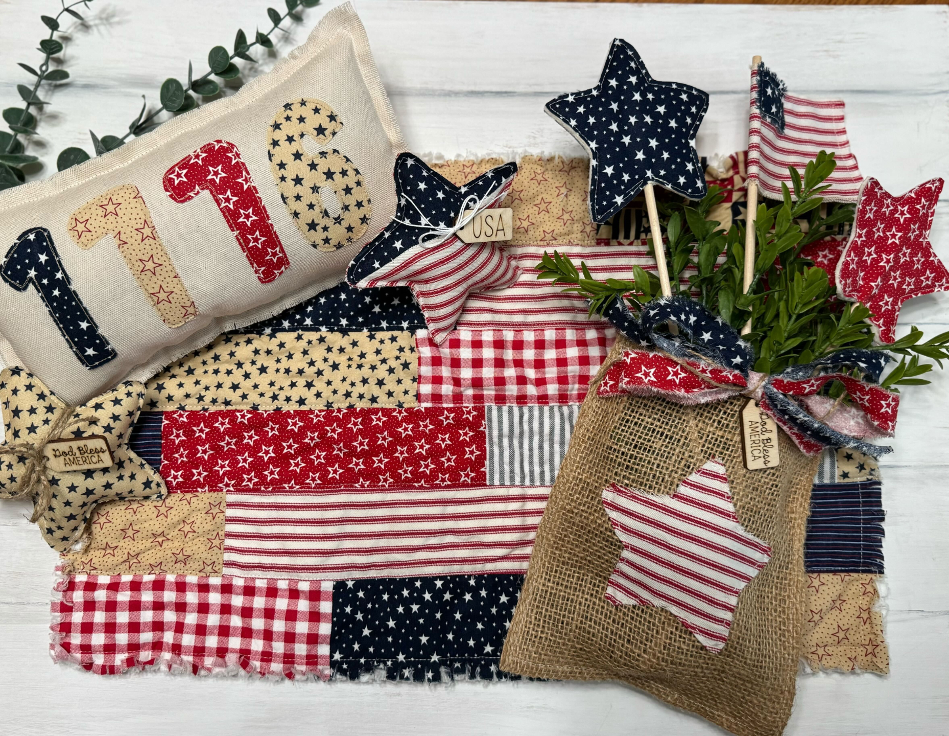 - Scrappy table piece, 1776 pillow, stuffed stars & patriotic fabric arrangements